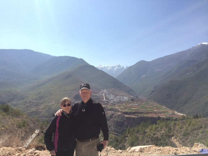 We woke up in Shangri-La at a bedroom elevation of 10,700 feet. But our travels today took us through the mountains encircling the city. We were told that these peaks rise as high as 16,000 feet. The road took us over passes, through tunnels that were three miles long, and along gorges above Tibetan villages and the Jinsha River. Here are some pics: