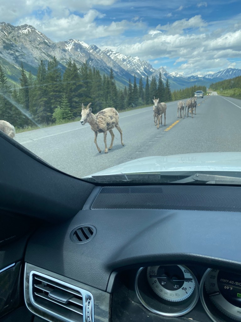 As we climbed into the higher passes, we started seeing signs to watch for wildlife on the road. While these kind of signs can usually be ignored, evidently that is not the case in Canada … We started seeing mountain goats by the side of the highway … A few miles later, they ( not the same flocks) were in the middle of the road, in no particular hurry, as if it was THEIR road.