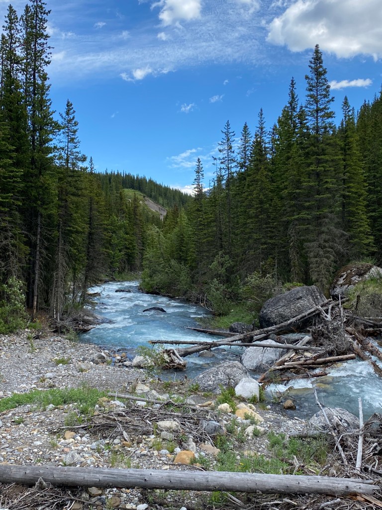 We stayed overnight here before driving into Banff the following morning. The drive north was short enough to allow us to get out on the trail to view the river valley before following a stream upward into the mountains.