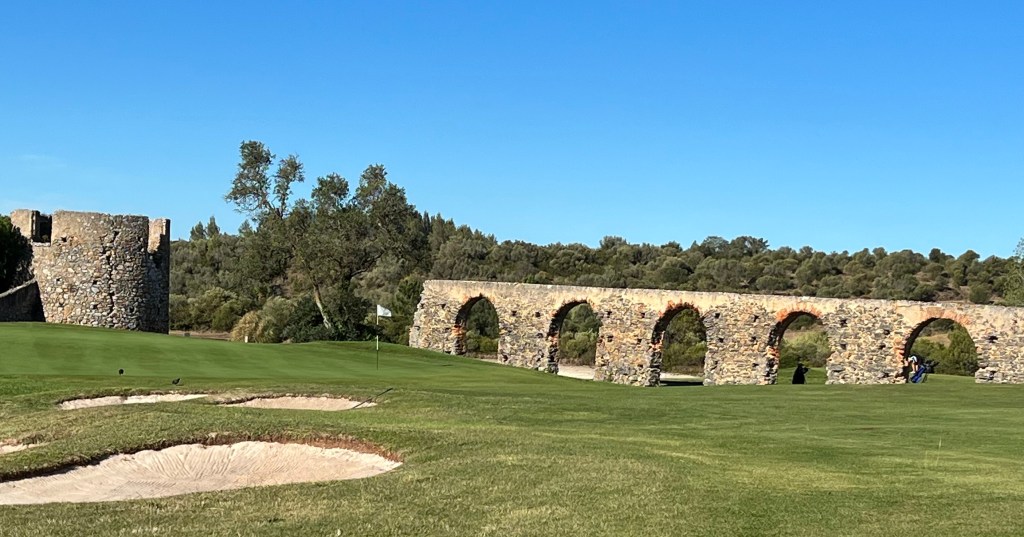 The two pics above were taken from the local golf course. The first shows the ruins of a 15th century aqueduct behind the fifth green. The second pic is from the back nine as I made the turn back toward the clubhouse and hotel … The peak in the distance anchors a cross at its summit and is on the vast acreage that surrounds the resort. Mrs Bear sampled the hiking trails while I challenged this excellent golf layout.