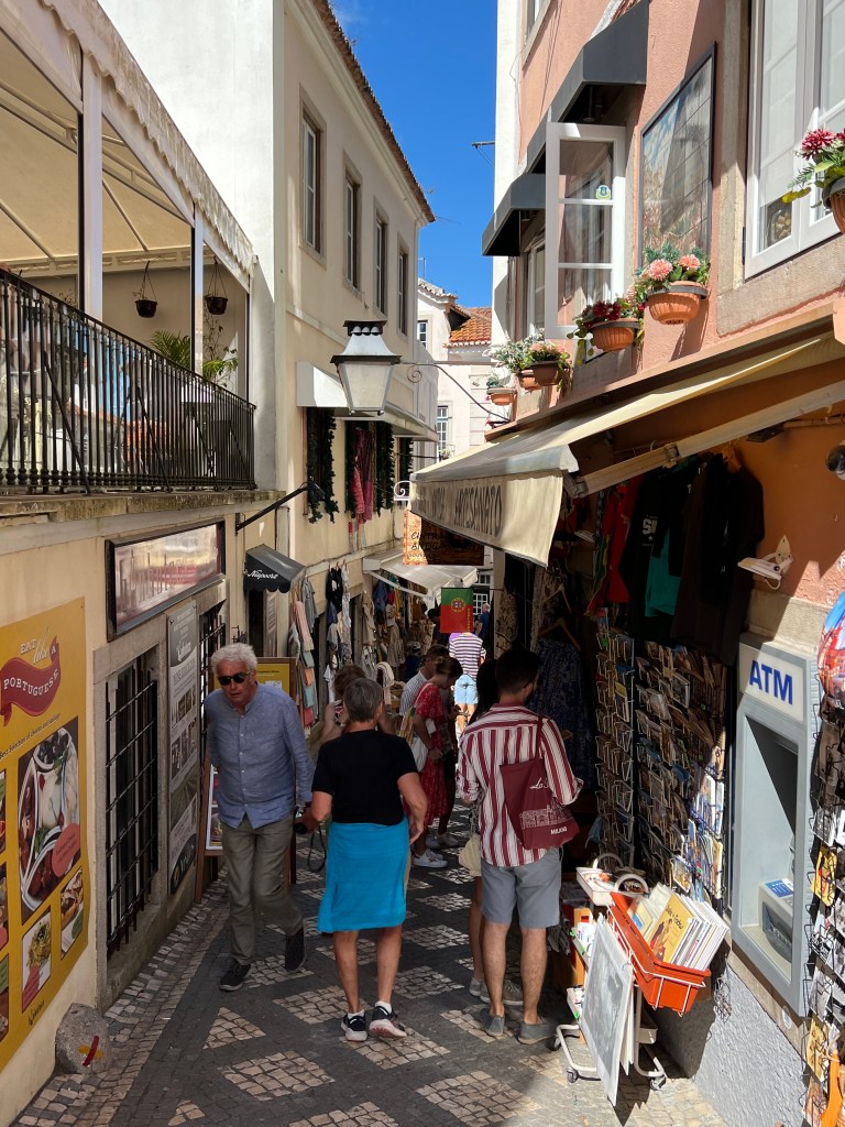 Sintra is kind of like a rich suburb of Lisbon. It is about 14 miles away and sits in the foothills of a mountain range that makes the summer temperatures a bit more comfortable. It is a lovely town with museums, churches, and numerous cobblestone streets with outdoor cafes, bars, and shops. While the residences we saw from the train on the way into Lisbon were exclusively high rise buildings, Sintra has as many single family residences as villas. Sintra is where the money is … And Sintra also has large ex pat communities which contribute to its upscale atmosphere.