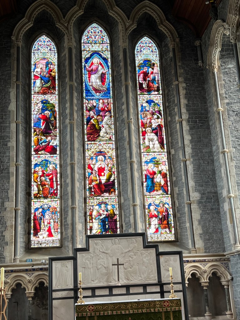 Here are a couple pics of the beautiful stained glass in the Cathedral, in case you don’t want to spend all your time climbing the bell tower. Our guide told us that Monks climbed the tower with provisions and outlasted Viking invaders a few centuries later. The Vikings finally figured out that they could punch a couple holes in the tower and smoke out the Monks.