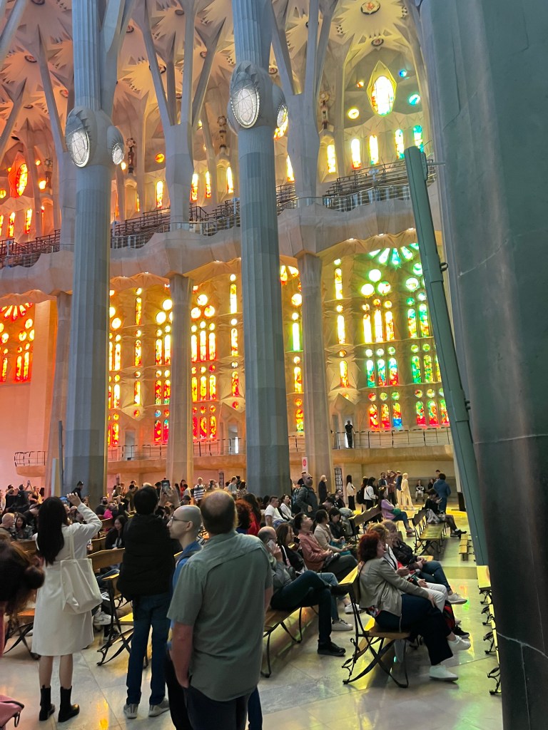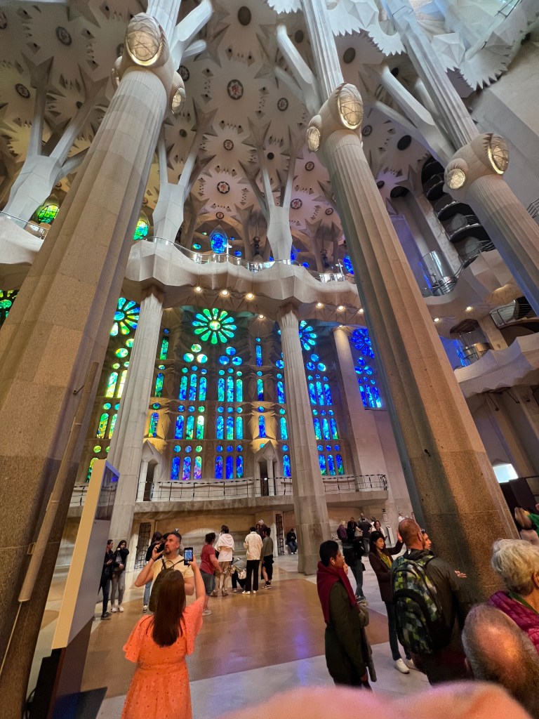 We took the guided tour, which began with a viewing of one side of the building’s outer facade. This is the part of the Basilica that was built first because its completion reportedly brought in a lot of heavy donations. The project has been built exclusively with private funding. The Basilica was started in 1882, but the original architect resigned a year later … Gaudi took over and worked on the project until his death in 1923. The Basilica was about 24% completed. Work was later disrupted by the Spanish Civil War in the 1930s, and more recently, by COVID.