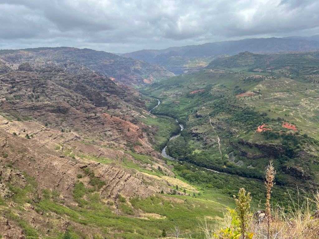 The road rose gradually along the canyon road … the canyon is about ten miles long and three thousand feet deep. This picture reminded me of looking down at the Colorado River in Arizona, but Hawaii’s canyon is much greener.