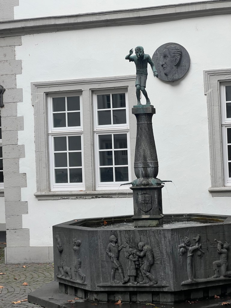 An interesting ending to Koblenz … I don’t recall the German name, so I’ll just call him the “ spitting boy .” Every two minutes he spits out a stream of water at unsuspecting tourists. You can see the wet cobblestones in the above picture. Mrs Bear was hesitant to take this pic, but I timed it well. The statue is like Old Faithful … a reservoir fills up, creating a level of pressure which stimulates the liquid release.