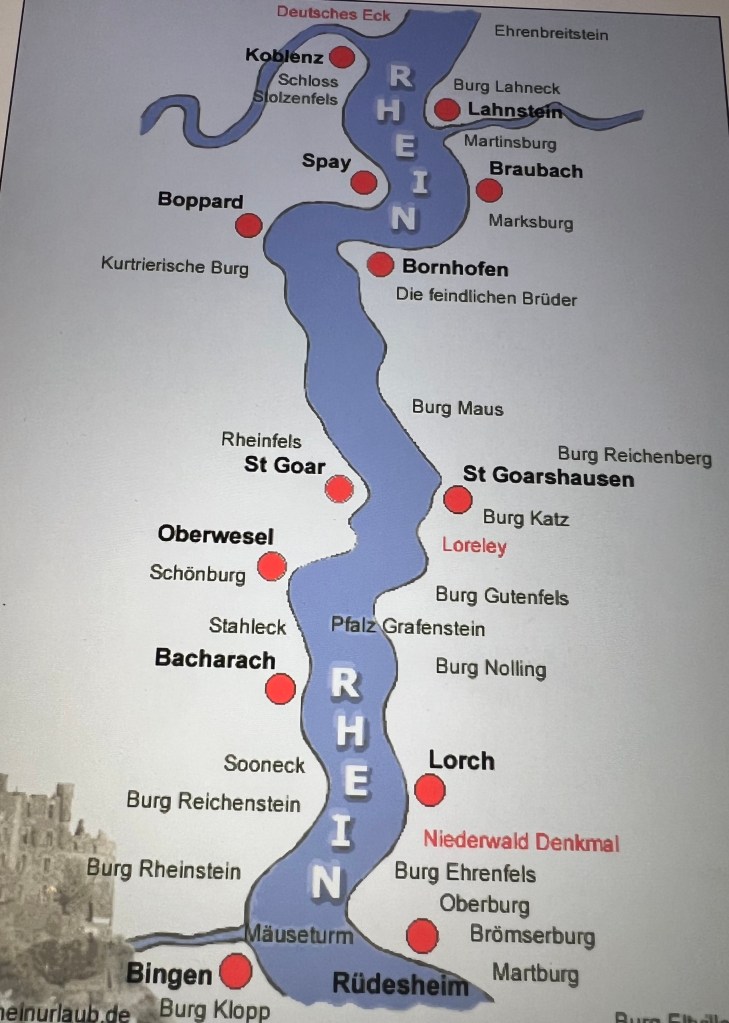 I will share some of the photos but not attempt to name or describe the individual castles. One can refer to the illustration above or google the Middle Rhine to extract specifics.