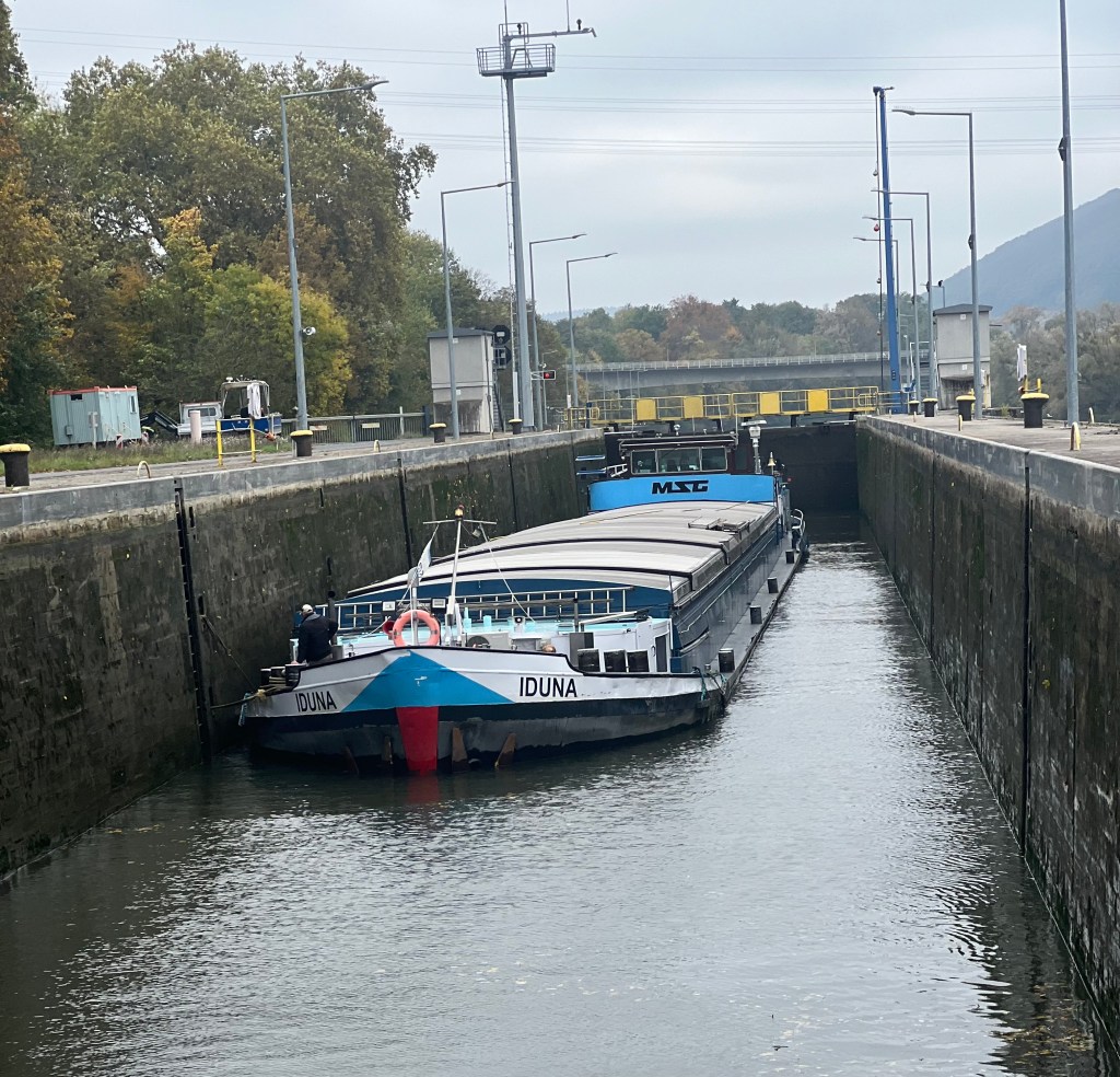 A couple notes from the pictures above. It is easy to see the gate that closes the lock in the first picture behind the barge. The other thing to notice is the height of the barge as the water rises. By the third picture, the barge is almost at the top of the side wall. Finally, this lock is taking us upstream as the water in the lock reaches the level of the river.