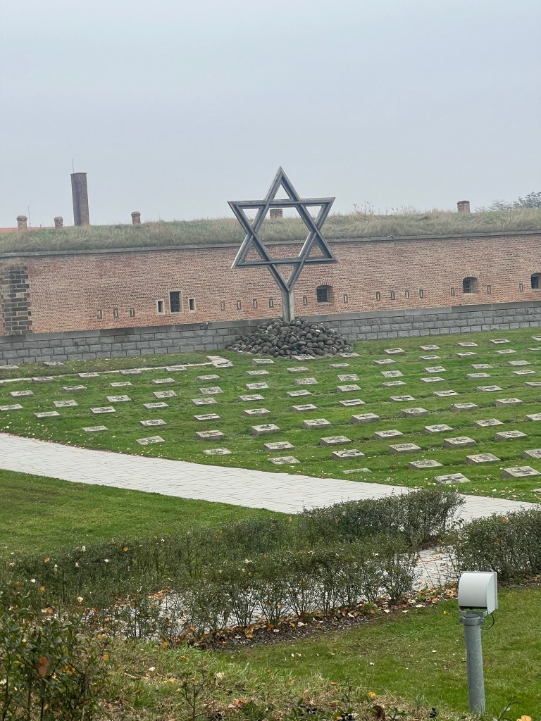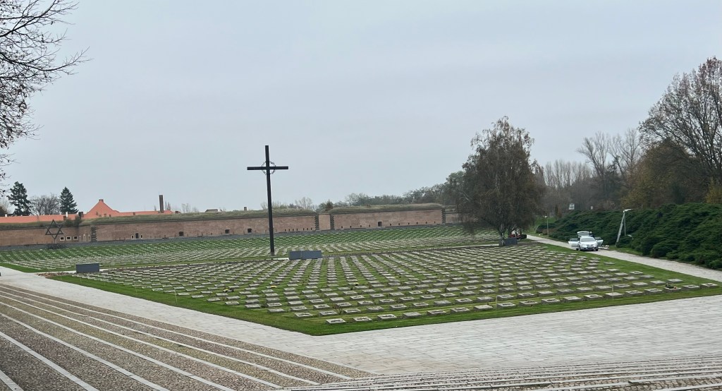 We toured Terezin’s Cemetery which contained roughly 15,000 bodies. A Cross and Star of David are mounted to honor the deaths of Christians and Jews. While some are buried in marked graves, most are in the mass graves you see just above. Our guide also said that many bodies were transported about 20 miles away to a mass crematory.