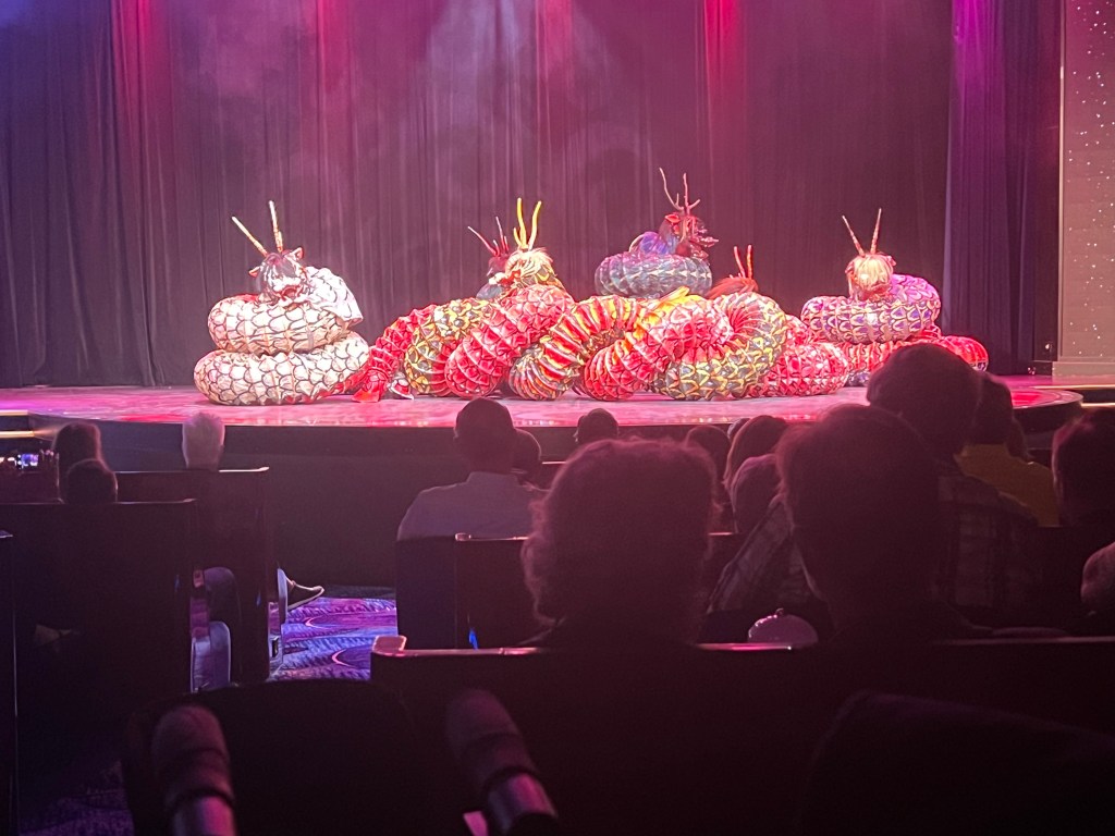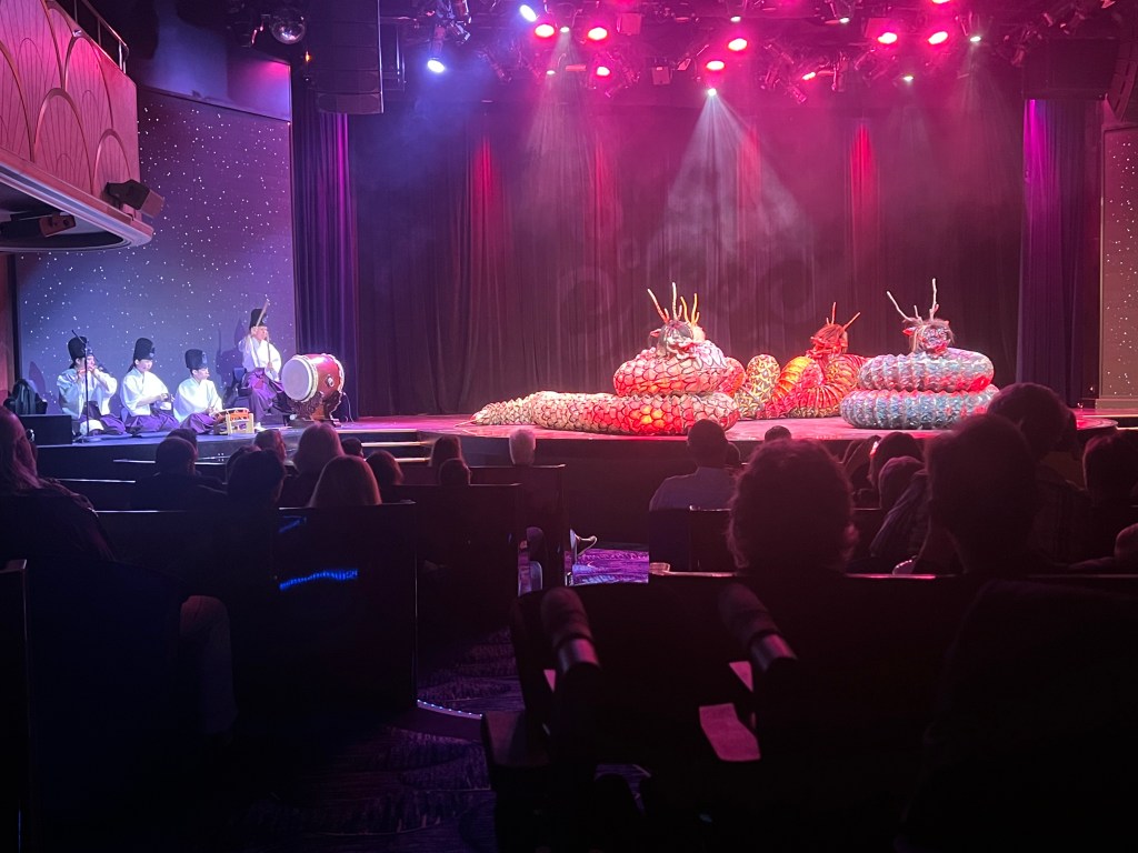 One final spot of Hiroshima was provided by our ship … They brought Japanese musicians and dancers to create a story of a Samurai slaying four dragons, one at a time.