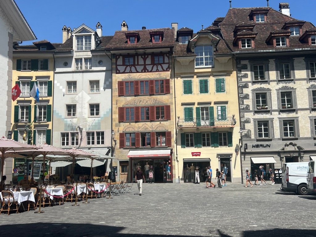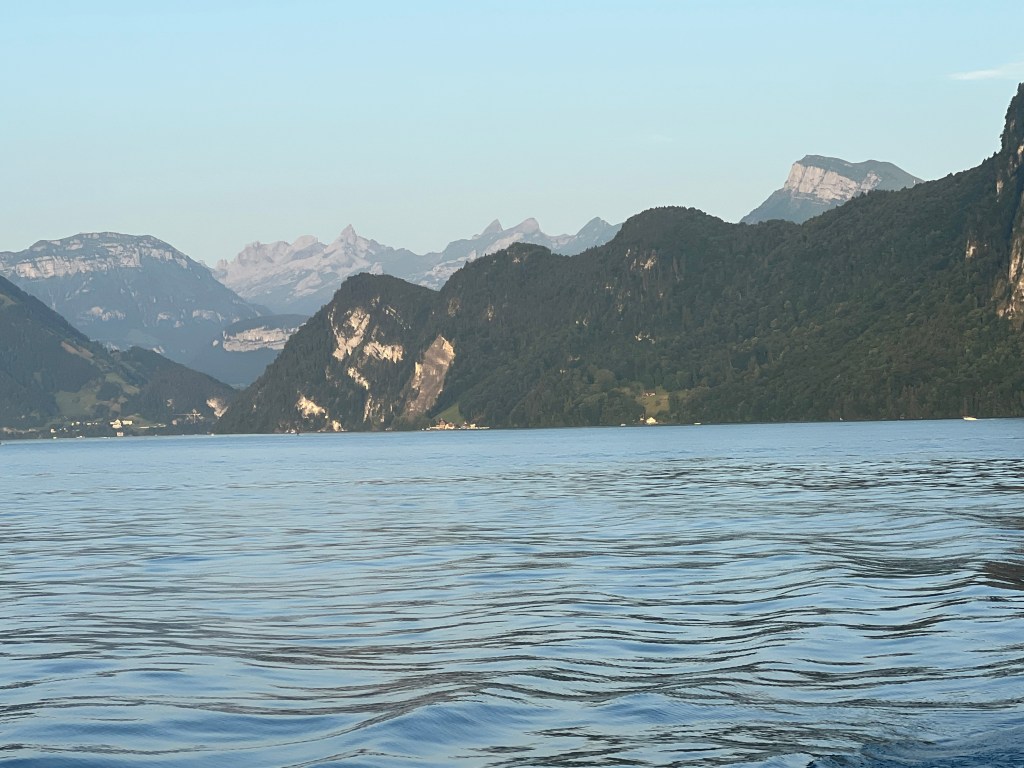 Lucerne is a 90 minute train ride from Zurich in central, Germanic Switzerland. It is known as a springboard to the higher mountains which surround a lovely lake. It is a very popular destination and a great orientation to the Alps. Here was my first mountain sighting: