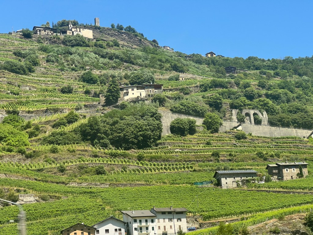We left Lugano behind by boarding a bus for a three hour ride that took us across the Swiss border into Italy. While the Alps remained, the terraced farming on the mountain slopes became much more extensive with local grape crops. In Switzerland, there would be occasional houses up the slopes … In Italia, there were entire small towns built halfway up the mountain.