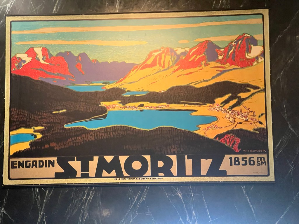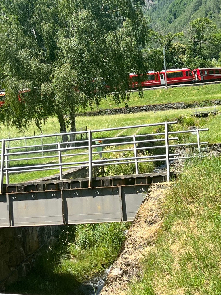 The bus ride was actually an extension of the Bernini Express, only offered in the summertime. The real fun begins now … the train combines two old rail lines and stretches across the Alps from Tirano, Italy to Chur, Switzerland (roughly four hours). It traverses 55 tunnels and 198 bridges and climbs to near 10,000 feet in elevation. We got off in St Moritz so it was a bit shorter but every bit as impressive.