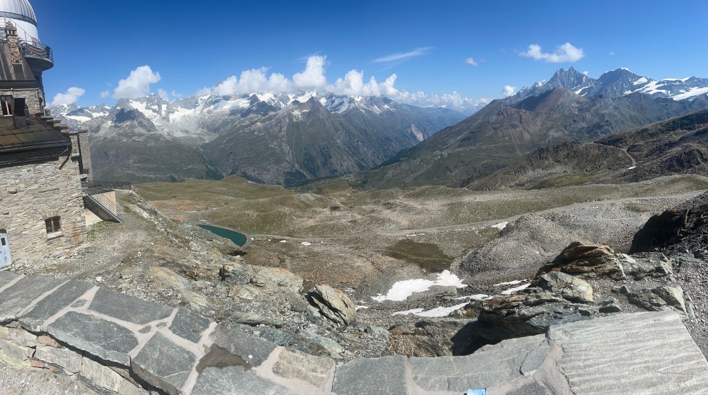 We took the Gomergrat cogwheel train to over 10,000 feet which almost gives an eye level view of the Matterhorn and its glaciers. We walked up to a 360 degree vista of the surrounding peaks. It was an achievement to make it up to the viewing area because the elevation is a challenge.