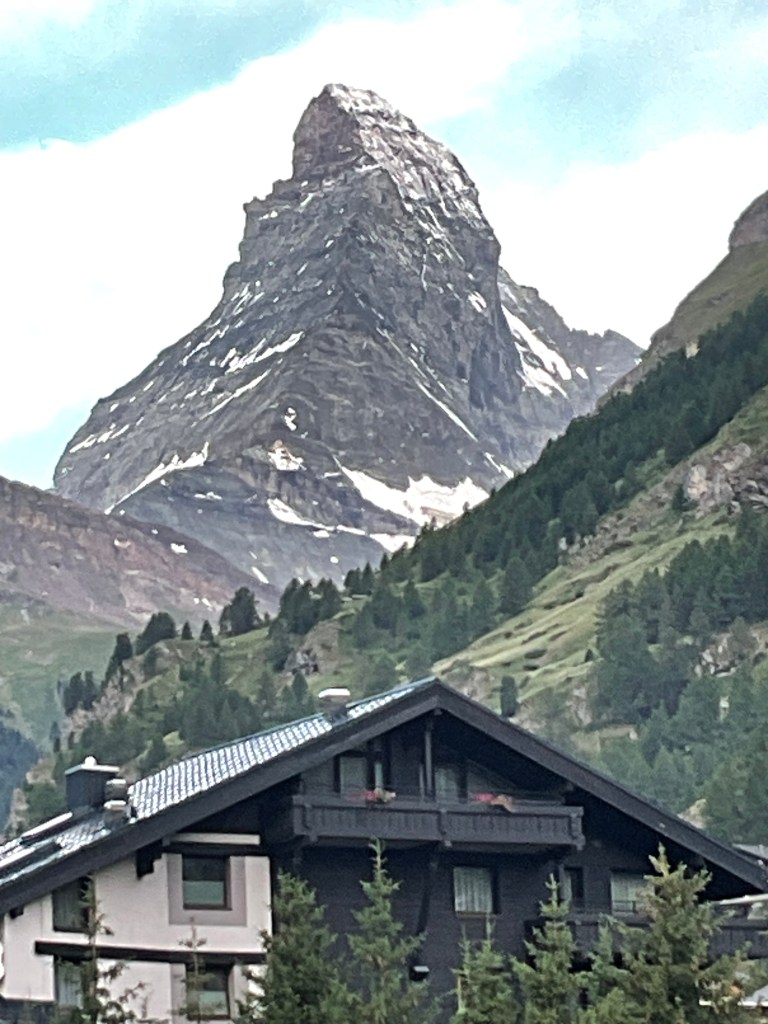 Which leads me back to actually seeing the Matterhorn !! The Alps are an impressive mountain range that was carved out by glaciers. Many of the mountains are craggy and sharp, like pieces have been shorn off. Which makes them even more impressive to gaze at. The trains, roads, and rivers tend to travel in narrow passages that often seem to go up box canyons. The mountain trains and trams then take you to the tops of the canyons.
