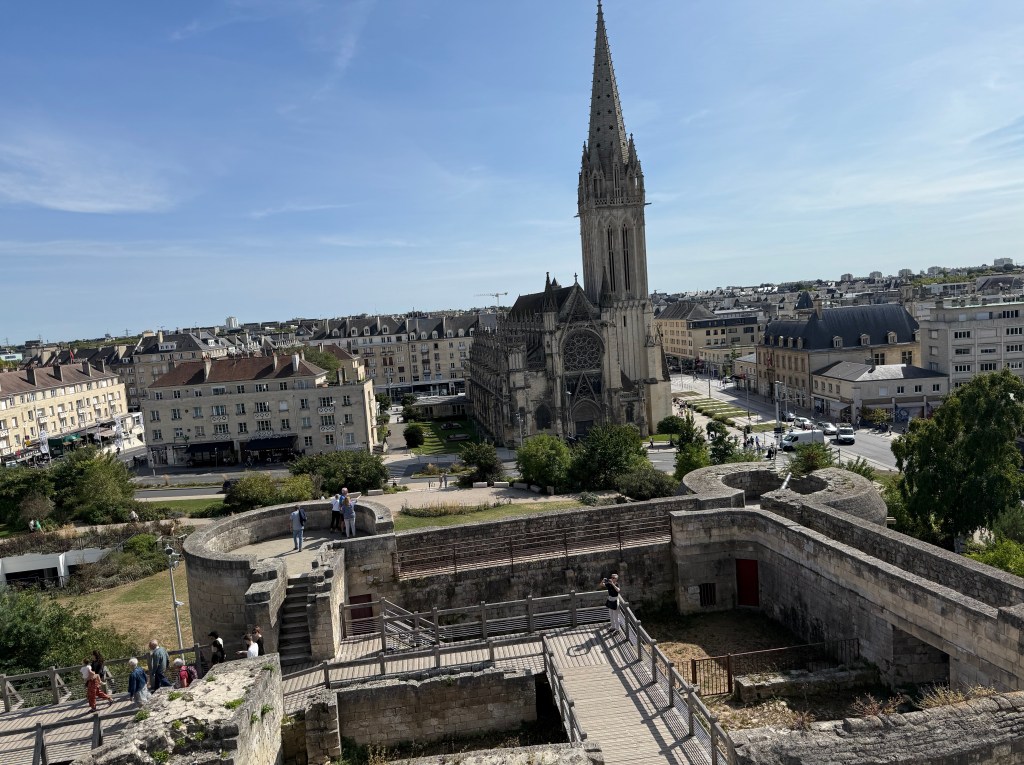 Prior to joining our group in Caen, we spent a day on our own walking around this beautiful city. It is located 120 miles northwest of Paris and is famous for the Château of Caen, built by William the Conqueror in 1060. It became his official residence. The pic above was taken from its walls and looks out over the ramparts to the Caen Cathedral. It is a massive structure.